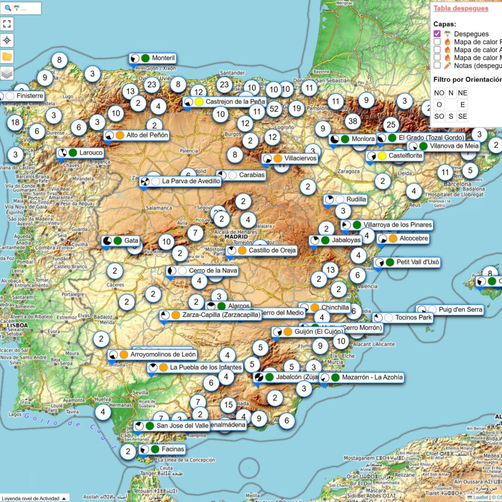 Mapa y tabla de despegues de parapente (zonas de vuelo) con enlaces a previsiones meteorológicas, mapas topográficos, vuelos y detalles.