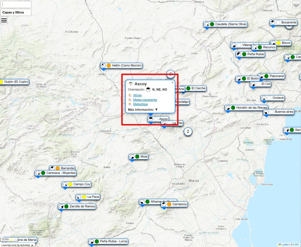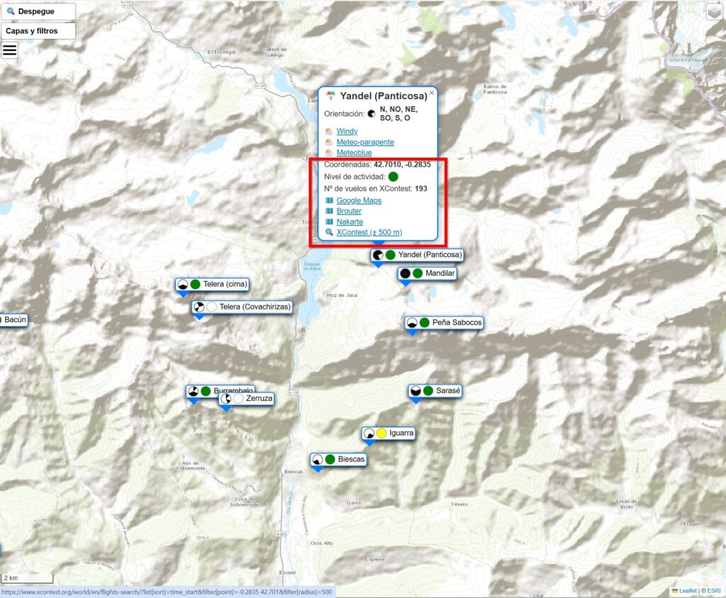 ✅ Puedes hacer clic o tocar un despegue y mostrará información básica de orientaciones y enlaces a webs de meteorología: