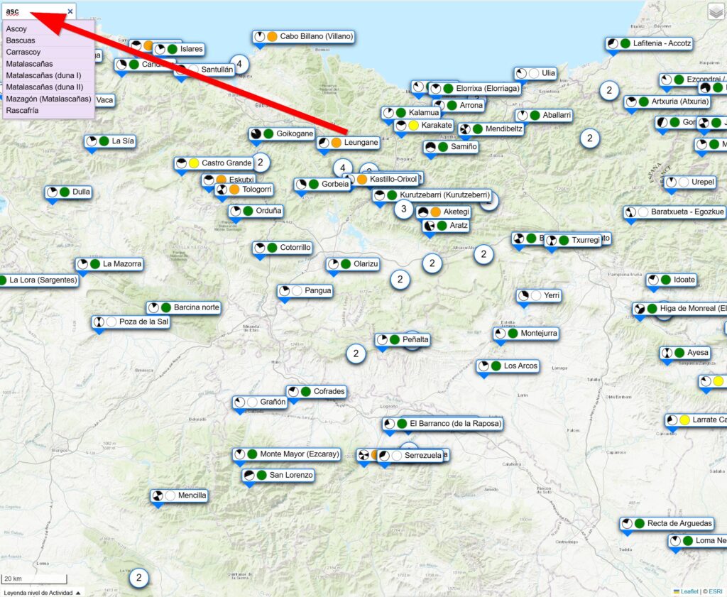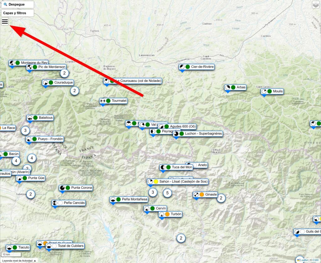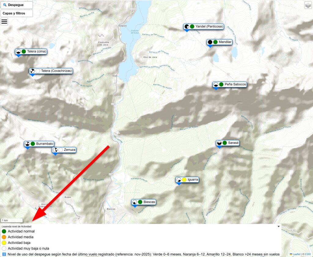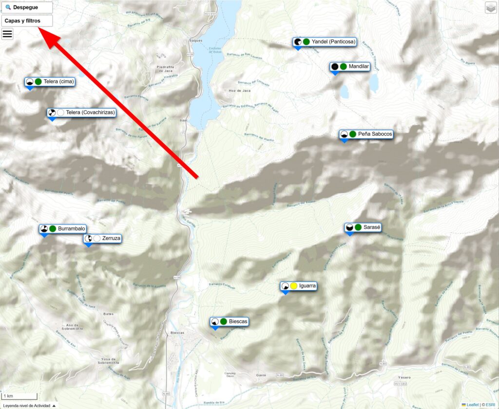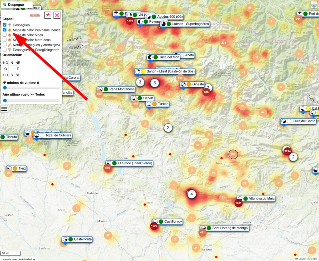 Esto quiere decir que son los datos tal cual están en la base de datos paraglidingearth.com pero no se ha corregido nombres o datos erróneos como en el caso de la capa "Despegues", pero si se da la opción de verlos y se ha incorporado al sistema de filtros por orientación, vuelos registrados y fecha del último vuelo, así como el nivel de actividad.
