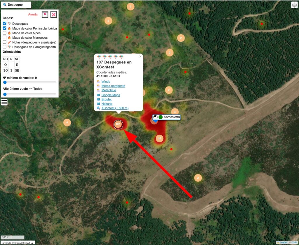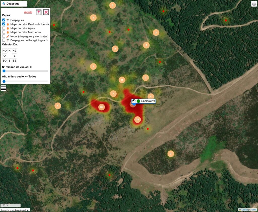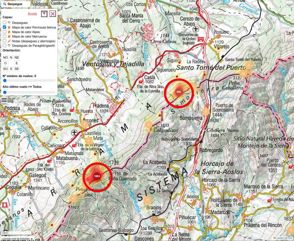 Si activas la capa "Despegues", verás además los nombres los despegues. En este caso vemos que esas zonas con alta densidad de despegues corresponden a Arcones y Somosierra:
