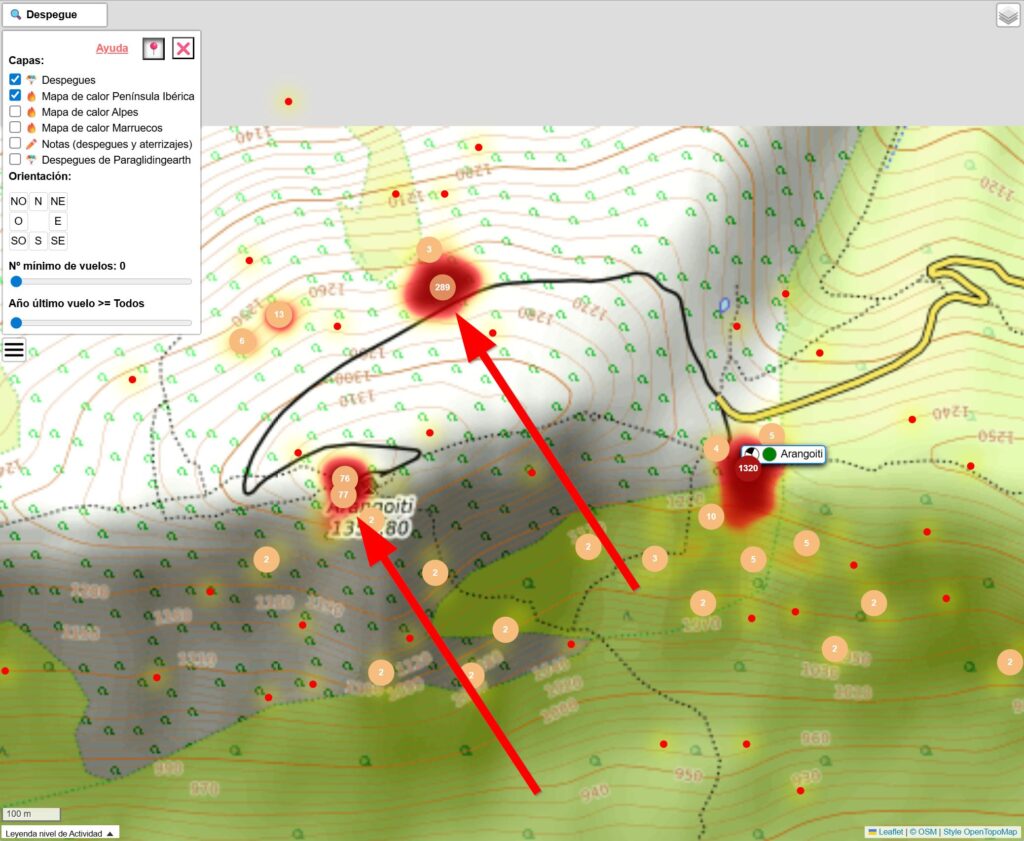 Otro ejemplo: vas a Arangoiti, no lo conoces y no tienes oportunidad de preguntar. Con las capas de calor, además de ver el lugar "habitual" de despegue, puedes descubrir lugares alternativos de despegue: