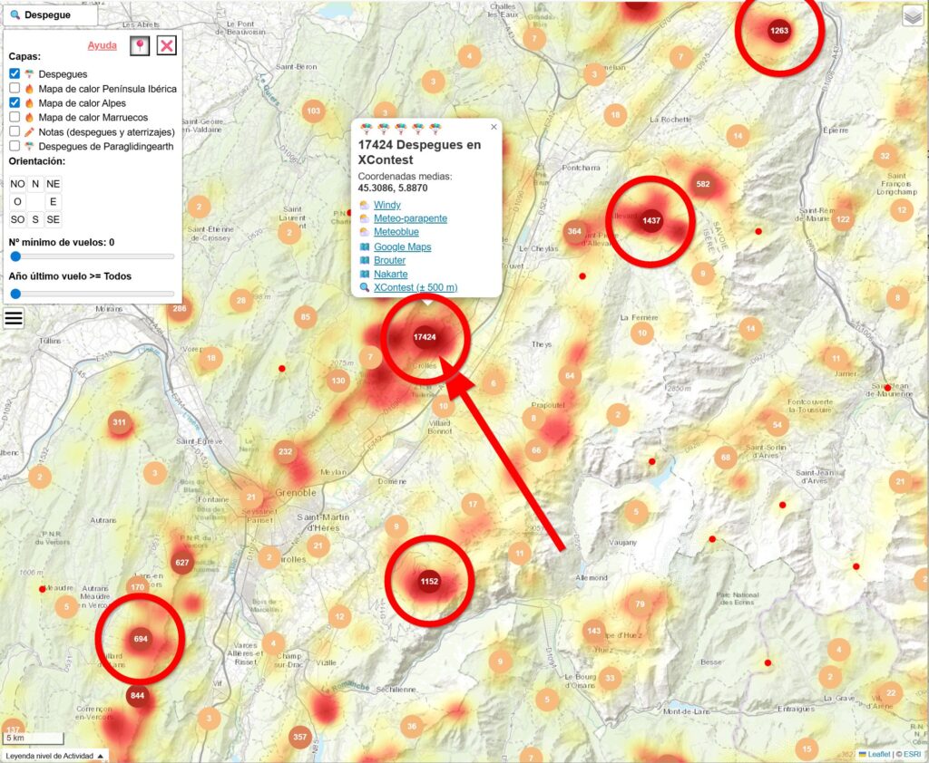 Otro ejemplo: viajas a Grenoble y no conoces o no ves en el mapa nombres de despegues (no están metidos todos, al menos aún). Con el mapa de calor de Alpes, puedes ver fácilmente dónde se despega habitualmente y obtener la meteo de esos puntos o incluso acceder a esos mapas topográficos que te hacen una ruta hasta el despegue (como Brouter):
