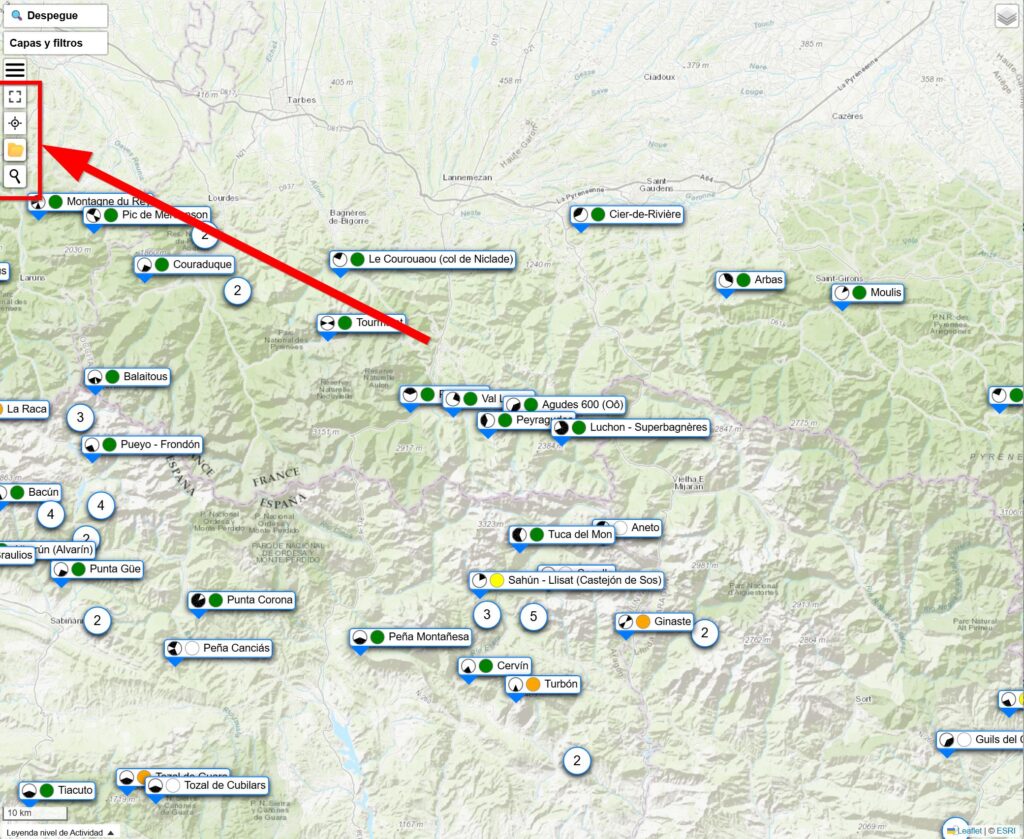 Los puntos de despegue se muestran individualmente o agrupados según el zoom y su cercanía. En caso de agruparse, se muestra un círculo con el número de despegues agrupados. Puedes hacer clic en ese círculo para ampliar esa zona y mostrar los despegues individuales o hacer zoom y se irán desagrupando automáticamente.