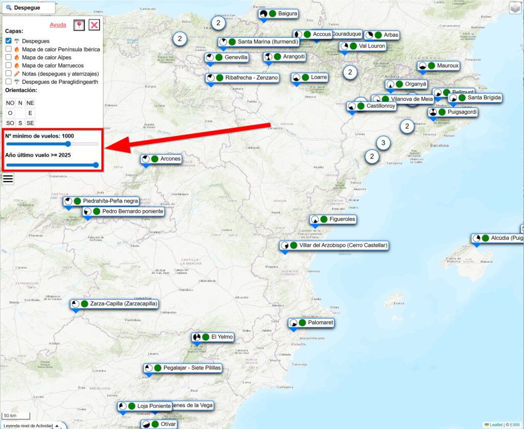 ✅ Puedes filtrar los despegues por el número mínimo de vuelos registrados en XContest y/o el año del último vuelo registrado, para mostrar únicamente las zonas con mayor o menor "importancia":