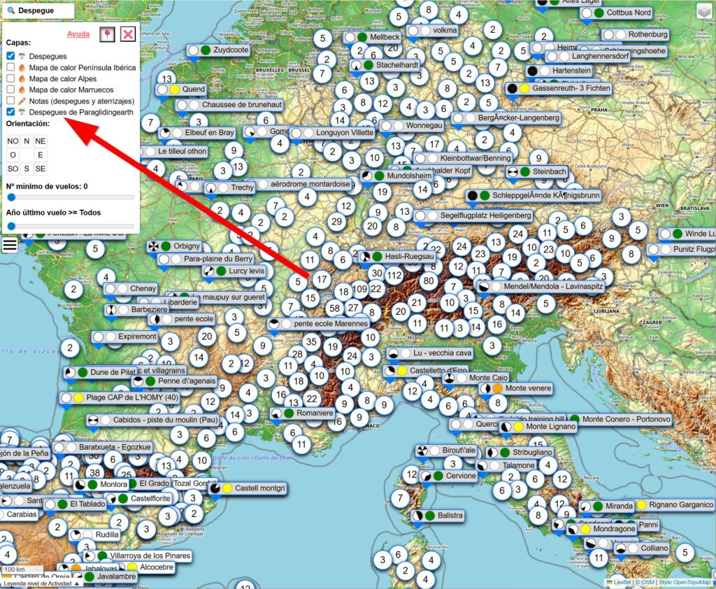 ✅ Puedes activar una capa especial "Despegues Paraglidingearth" que muestra despegues de otras zonas o países "no depurados":