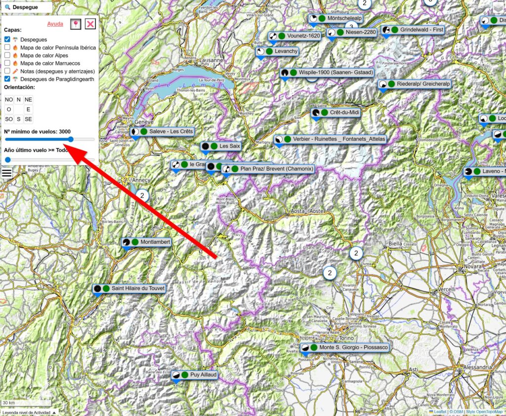 Ejemplo: viajas a la zona occidental de Alpes quieres ver únicamente los despegues principales. Para ello usas el filtro "Nº mínimo de vuelos" y muestras solo los que tengan más de 3000: