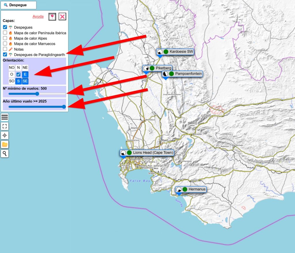 Ejemplo: viajas de Sudáfrica, concretamente a Ciudad del Cabo. Quieres ver los lugares usados actualmente y que sean populares (más de 500 vuelos registrados y, al menos, alguno reciente). Hay vientos de componente SE, E o S. Aplicas los filtros y se muestran 5 lugares: